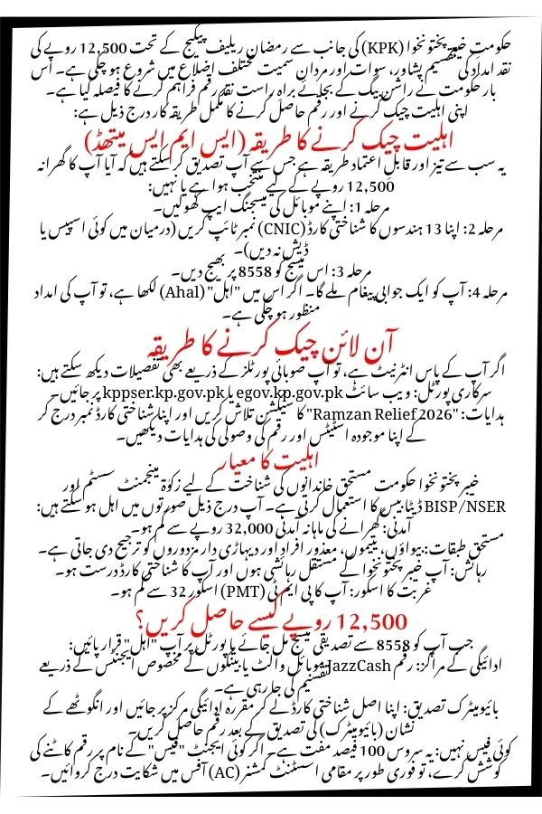 To get the Ramzan Package 2026 in Khyber Pakhtunkhwa (KPK), you should follow the official 8558 verification process. For 2026, the provincial government has increased the assistance amount to Rs. 12,500 per eligible family, delivered as direct cash instead of ration bags.